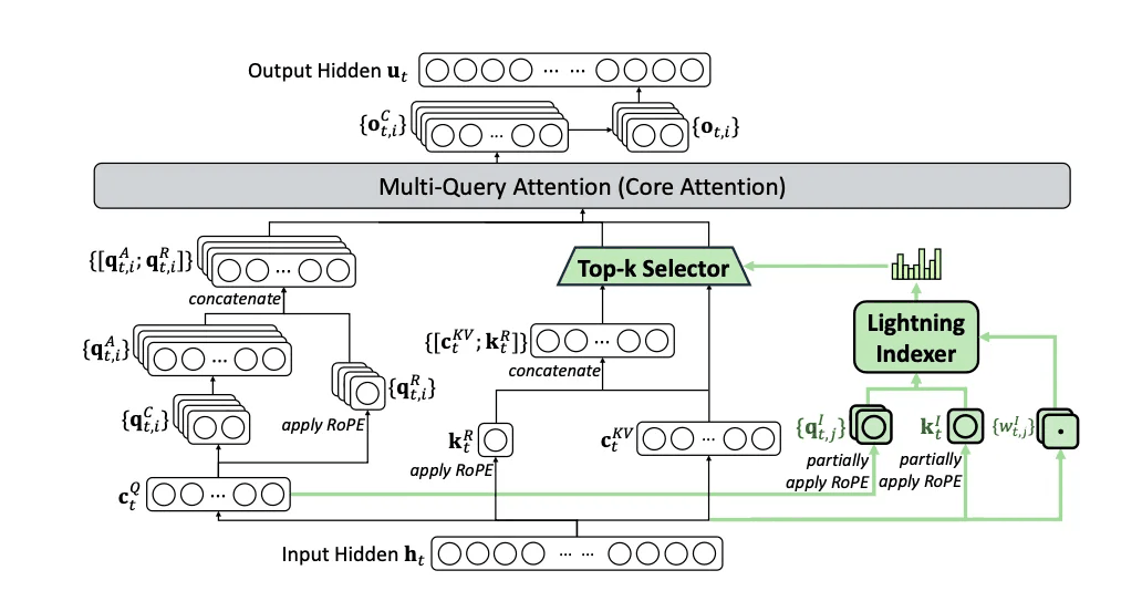 这次V3.2-Exp的真正杀手锏是DSA(DeepSeek稀疏注意力)机制。如果说传统注意力机制像一个事无巨细的管家,每个信息都要处理,那DSA就是一个精明的助理,只关注真正重要的内容。