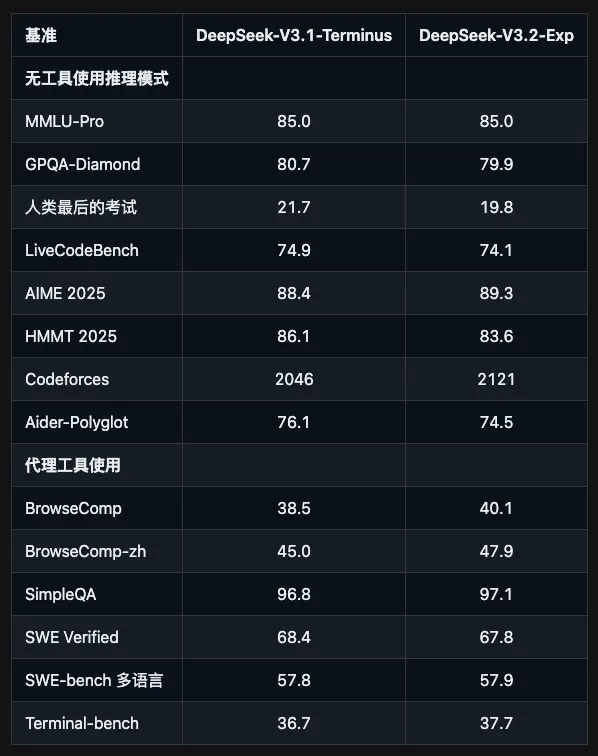 就像你原来跑5公里要30分钟,现在只需要10-15分钟,而且还不怎么累。更牛的是,虽然速度快了这么多,但质量一点没打折扣,在各种公开测试中的表现和V3.1-Terminus基本持平。